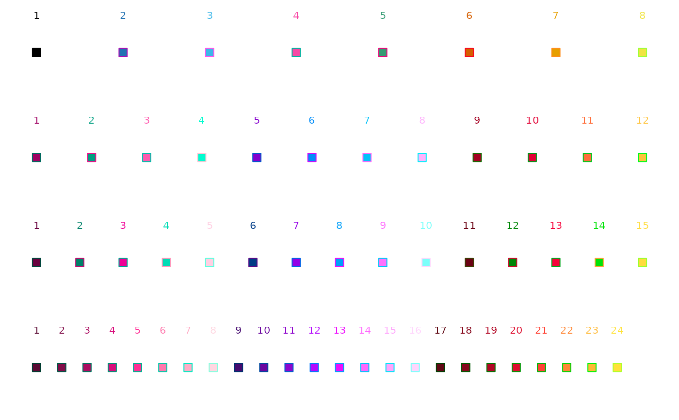 points(1:24, rep(0, 24), bg = cbPalette24, col = altPalette24,