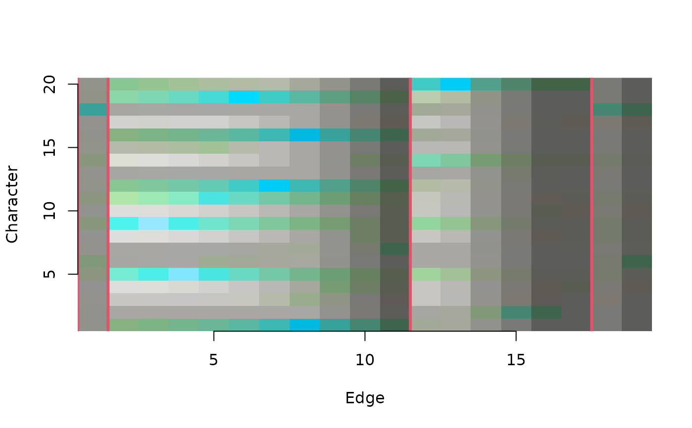 "info": The amount of information in each character-edge pair, in bits;"relInfo": The information, normalized to the most information-rich pair;"quality": The normalized mutual information of the pair;"col": The colours used to plot the table.